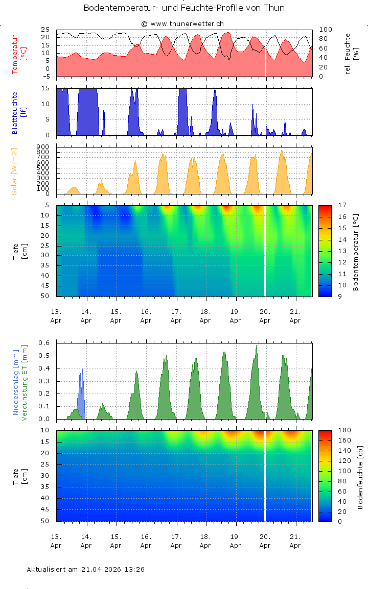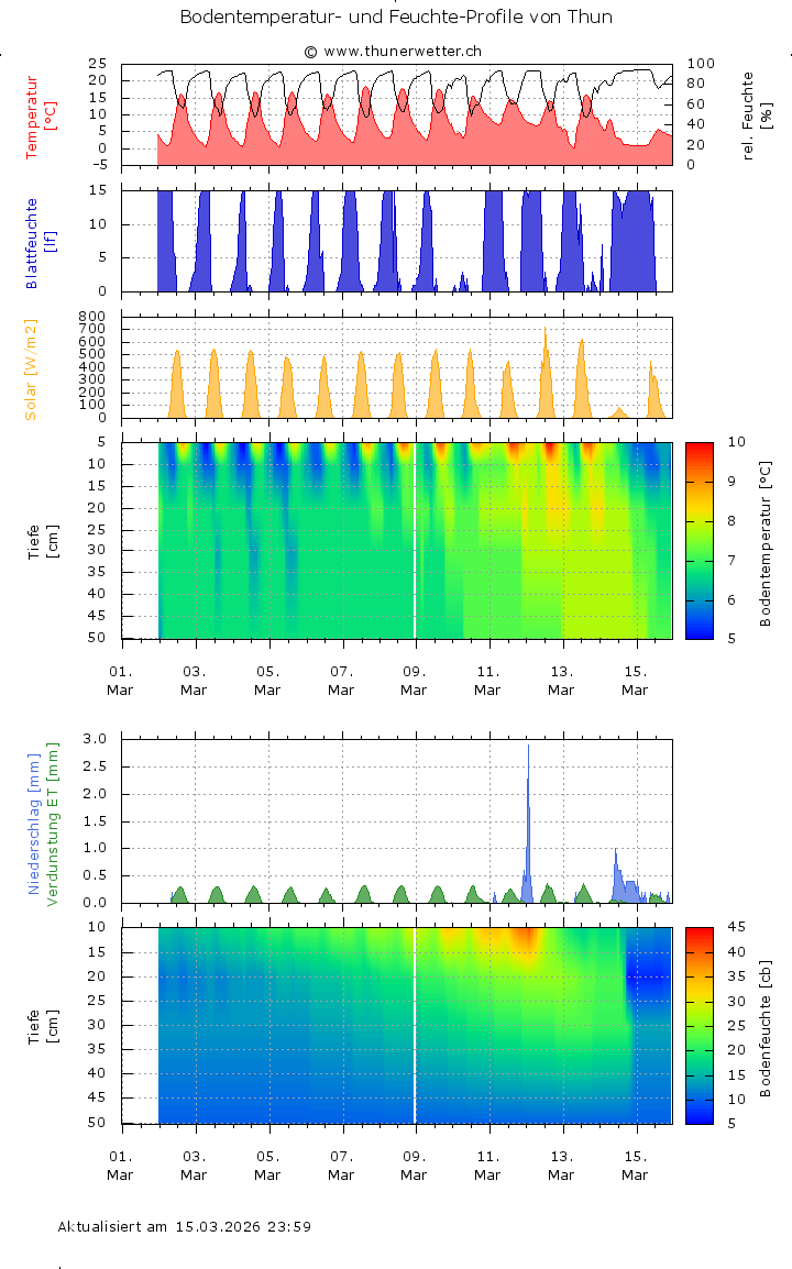 Im unteren und mittleren Bereich werden auf Basis stündlicher Messungen, die Bodentemperaturen in 5, 10, 20, 30 und 50 cm Tiefe und die Bodenfeuchte in 10, 20, 30, und 50 cm Tiefe als Profilschnitt dargestellt.