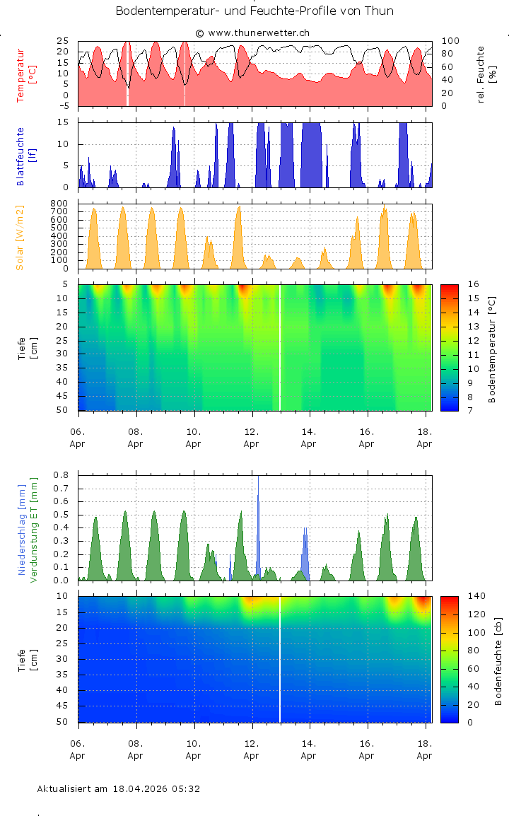 Im unteren und mittleren Bereich werden auf Basis stündlicher Messungen, die Bodentemperaturen in 5, 10, 20, 30 und 50 cm Tiefe und die Bodenfeuchte in 10, 20, 30, und 50 cm Tiefe als Profilschnitt dargestellt.